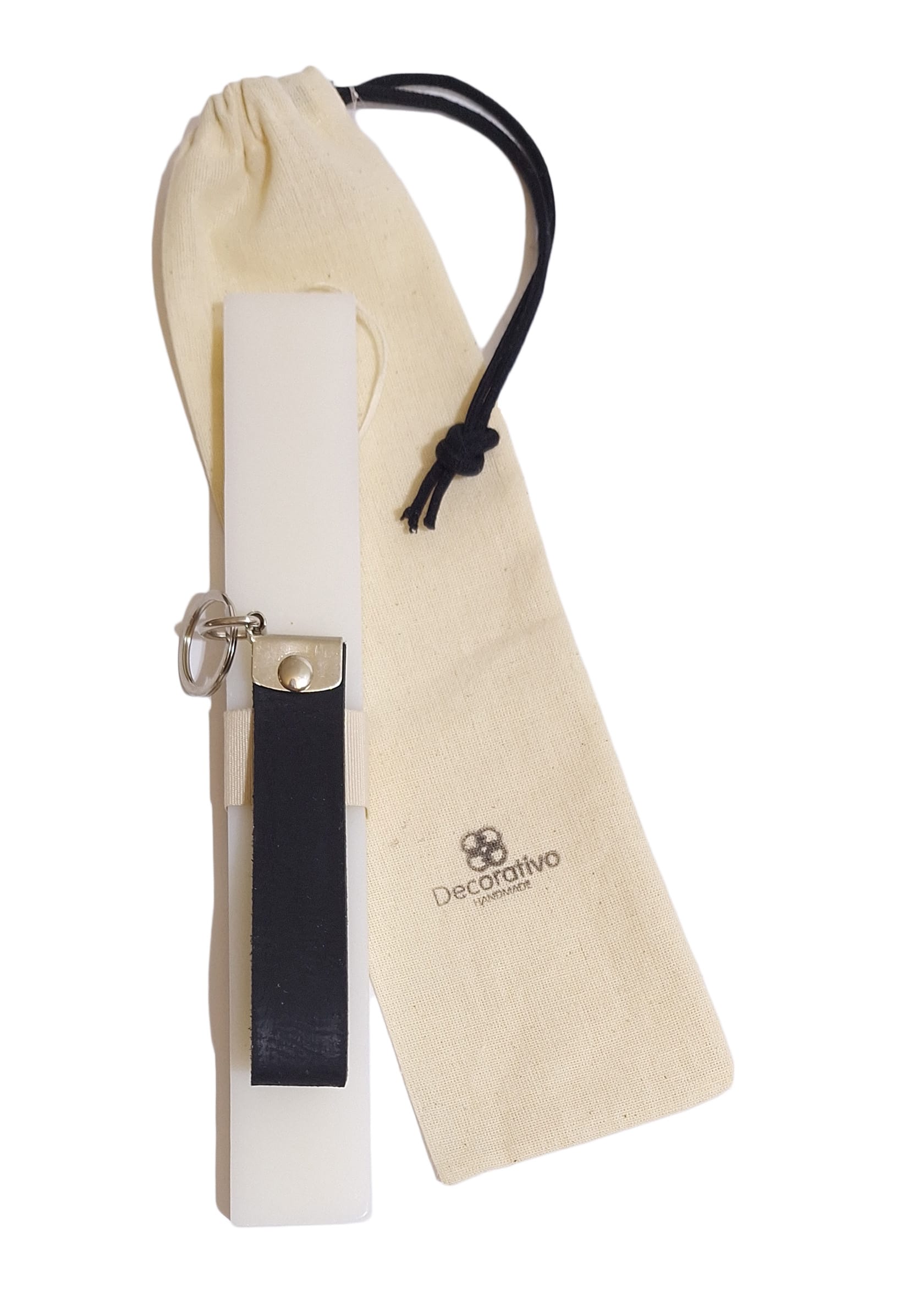 Χειροποίητη πασχαλινή λαμπάδα πλακέ με δερμάτινο μπρελόκ σε υφασμάτινο πουγκί.