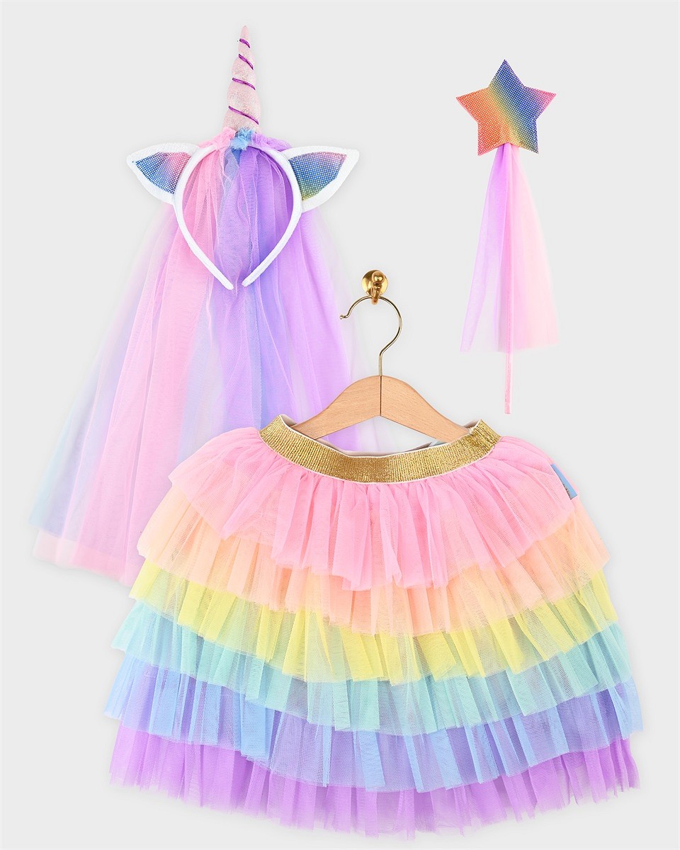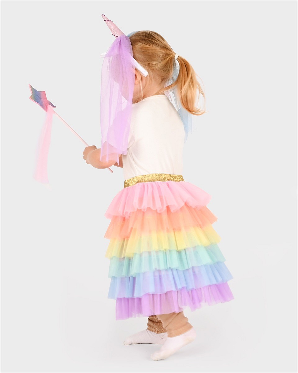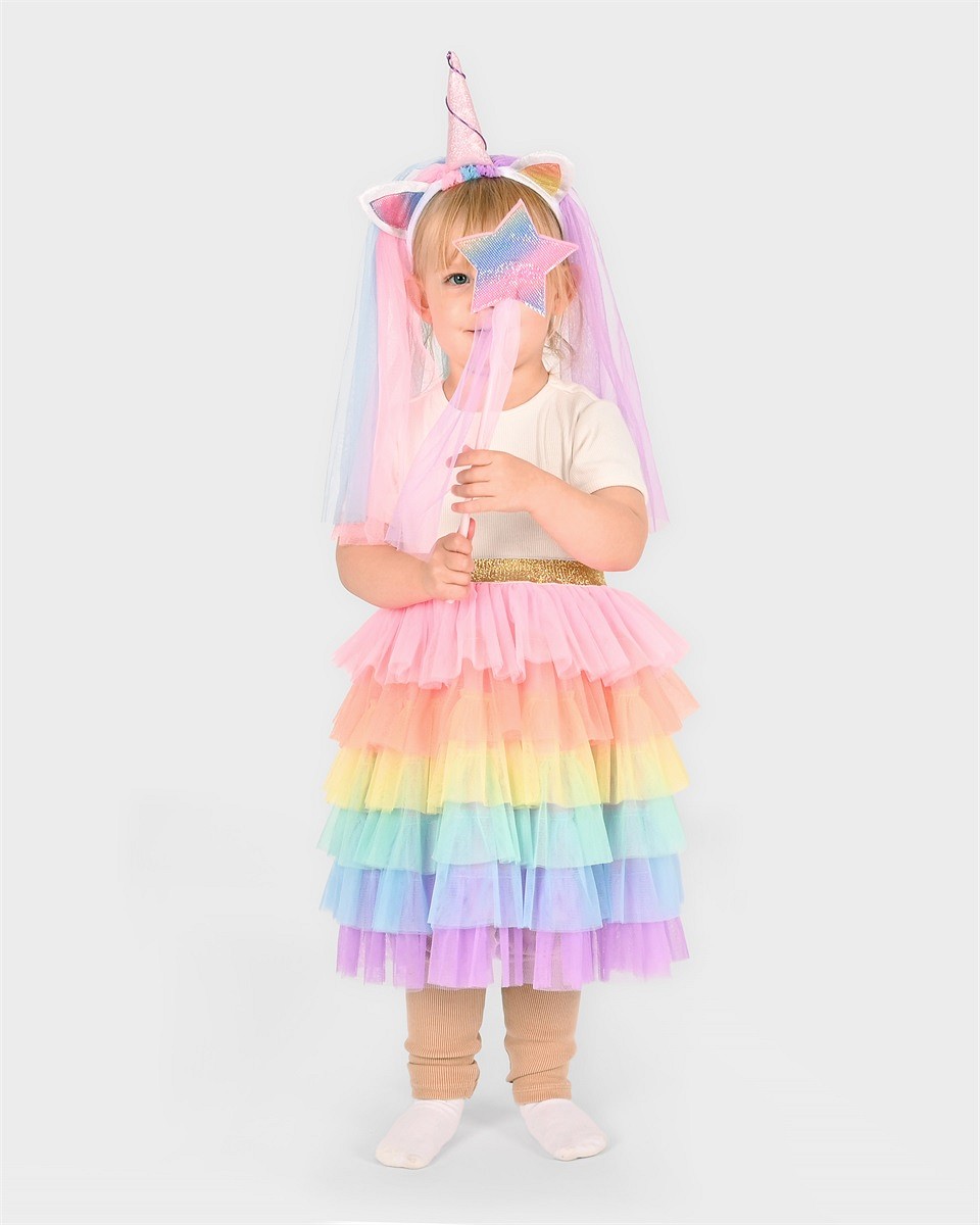 Γίνε ένας πολύχρωμος μονόκερος με το σετ τούλινης φούστας UNICORN! Η φούστα αποτελείται από πολλές στρώσεις από αφράτο τούλι στα χρώματα του ουράνιου τόξου που επιπλέει σε κάθε βήμα. Το σετ συνοδεύεται επίσης με μια τιάρα μονόκερου με αυτιά, κέρατα και ασορτί πέπλο από τούλι και ένα ραβδί με αστέρι στην κορυφή και κορδέλα από τούλι.