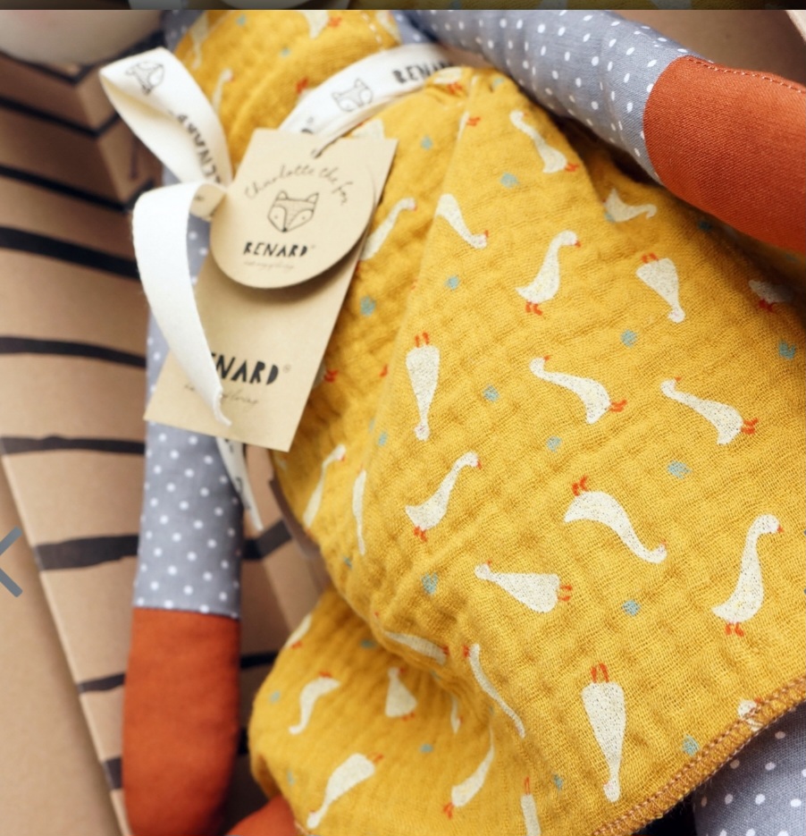 Πασχαλινή λαμπάδα για αγοράκια με μεγάλο χειροποίητο κουκλάκι αλεπού της ελληνικής εταιρείας Le Petit Renard, σε αρωματικό κερί 32 εκ. Το κουκλάκι είναι κατασκευασμένο από βαμβακερό ύφασμα, φοράει φόρεμα από βαμβακερή μουσελίνα με μικρά παπάκια και είναι απολύτως ασφαλές για μωρά. Πλένεται στο πλυντήριο στους 30 βαθμούς.