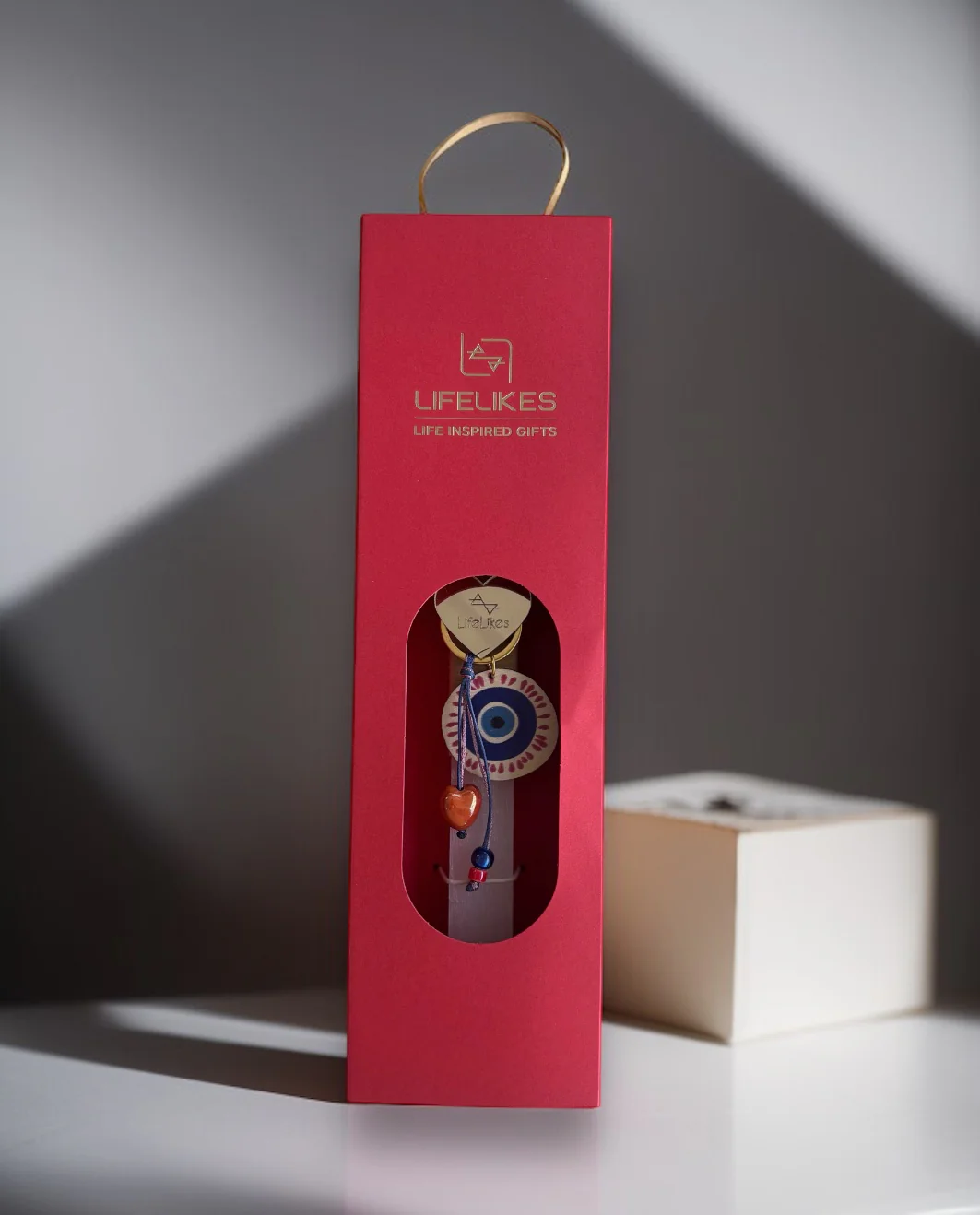 Ανακαλύψτε μια ξεχωριστή χειροποίητη λαμπάδα με αρωματικό κερί, διακοσμημένη με ένα κομψό μαγνητάκι-καρδιά και ένα πανέμορφο ξύλινο ματάκι για καλοτυχία και προστασία. Το ματάκι είναι μπρελόκ, που μπορεί να στολίσει τα κλειδιά ή την τσάντα σας. Είναι τοποθετημένη σε μια εντυπωσιακή κόκκινη συσκευασία, ιδανική για δώρο σε αγαπημένα πρόσωπα. Ένα μοναδικό σύμβολο τύχης και αγάπης, ιδανικό για το Πάσχα!