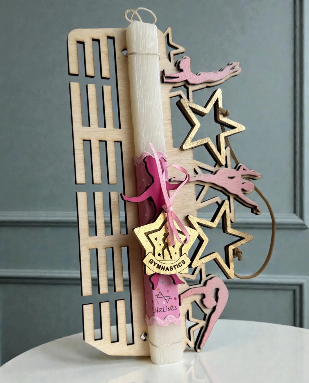 Μια ξεχωριστή, αρωματική λαμπάδα Lifelikes που συνδυάζει το πασχαλινό δώρο με ένα υπέροχο και χρηστικό διακοσμητικό για το παιδικό δωμάτιο. Η λαμπάδα συνοδεύεται από ξύλινο κάδρο τοίχου με θέμα τη ρυθμική γυμναστική, ειδικά σχεδιασμένο με υποδοχές για να κρεμάει τα μετάλλια της, δημιουργώντας μια όμορφη γωνιά γεμάτη επιτεύγματα και αναμνήσεις. Το διακοσμητικό στοιχείο επάνω στη λαμπάδα είναι μαγνητάκι, ώστε να μπορεί να αφαιρεθεί και να χρησιμοποιηθεί ξανά, ενώ το κάδρο κρεμιέται εύκολα στον τοίχο και παραμένει στο δωμάτιο και μετά το Πάσχα ως μόνιμη διακόσμηση. Ένα δώρο με νόημα, που ενθαρρύνει, εμπνέει και επιβραβεύει κάθε μικρή αθλήτρια. Υπάρχει επίσης δυνατότητα προσωποποίησης με το όνομα του παιδιού, για ένα δώρο που ξεχωρίζει πραγματικά. Διάσταση κάδρου: 26*16,5 cm