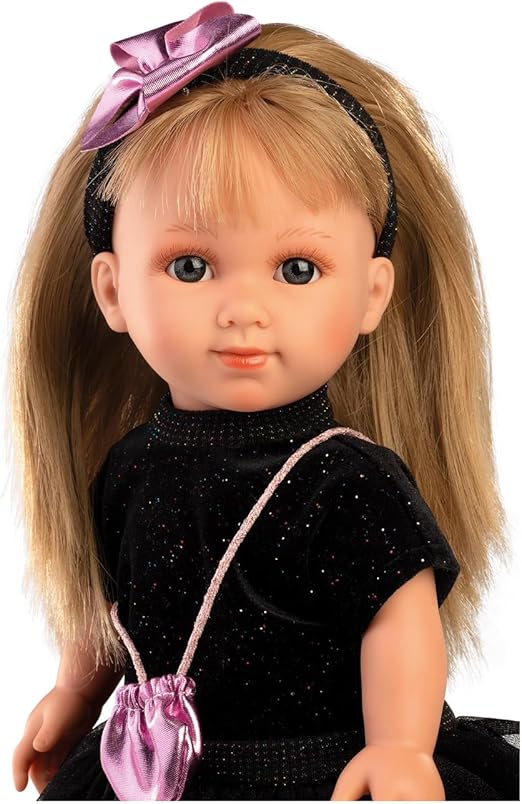 Εκπληκτική κούκλα με μαλακό σώμα ξανθιά 35cm με μάυρη μπλούζα με glitter και μαυρη τούλινη φούστα. Κατασκευασμένη στην Ισπανία. Φοράει εξαιρετικά χειροποιητα ρούχα και έχει εκπληκτικές λεπτομέριες.